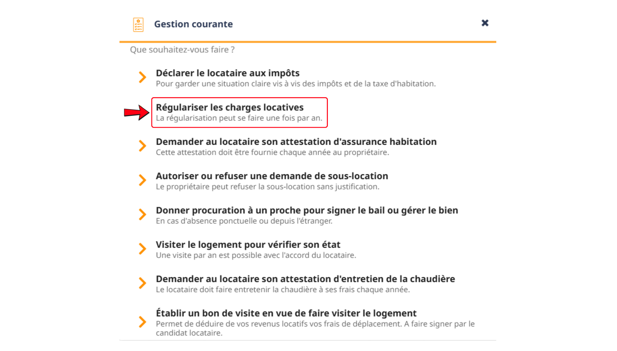 2 - Choisissez "Régulariser les charges locatives" et complétez le formulaire jusqu'à la fin