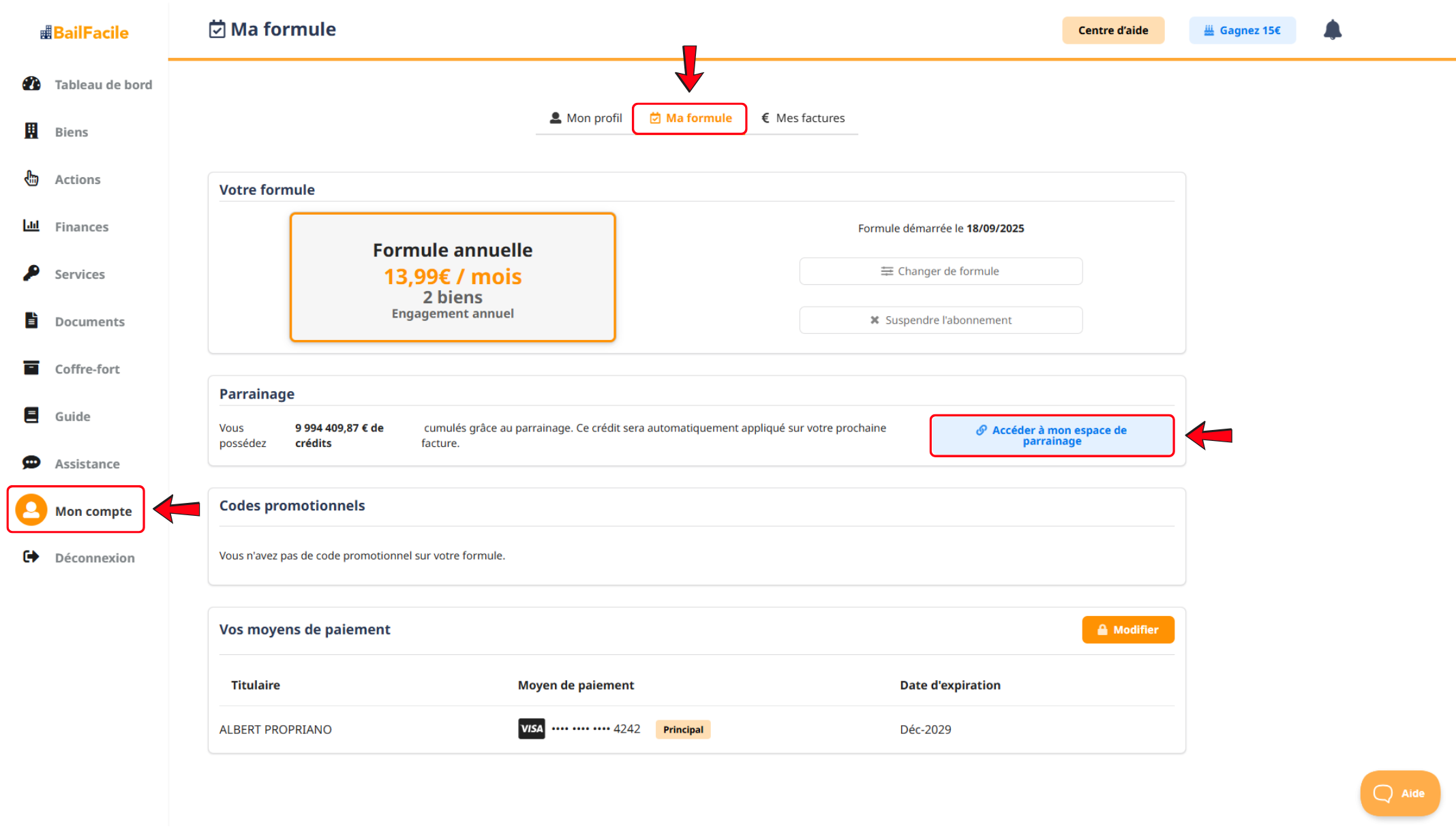 ➡️ ou depuis l'onglet "Ma Formule" de la page "Mon Compte", en cliquant sur "Accéder à mon espace de parrainage"