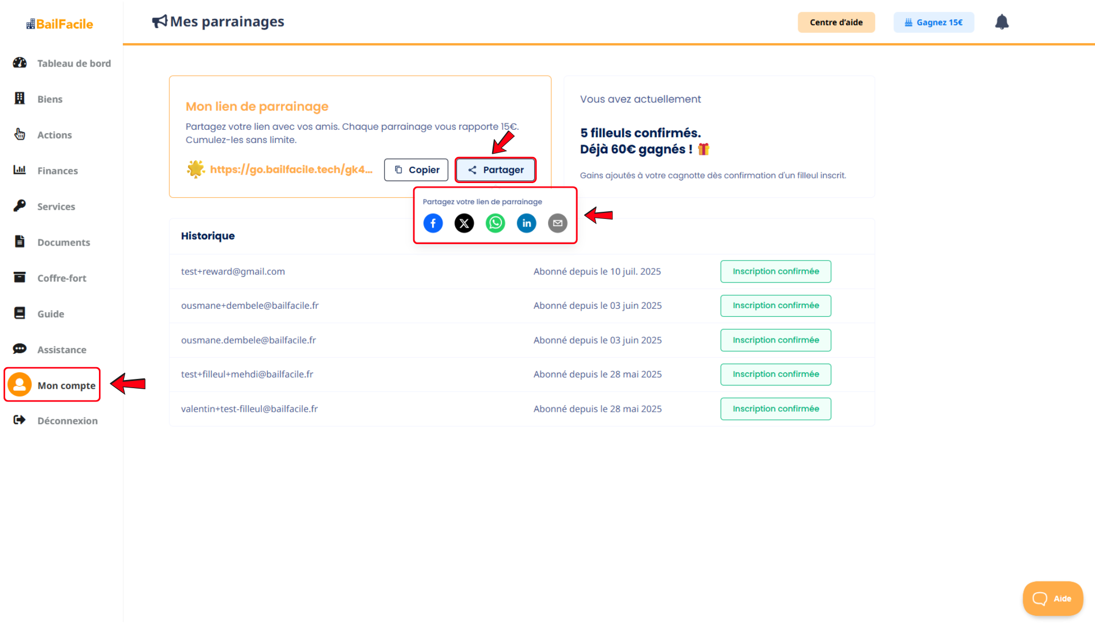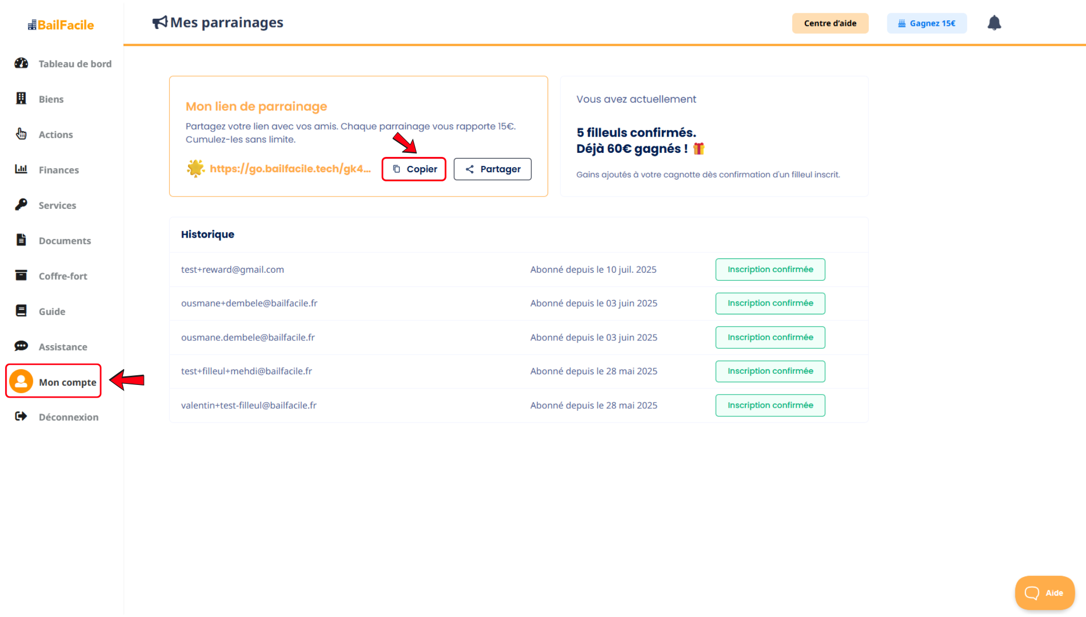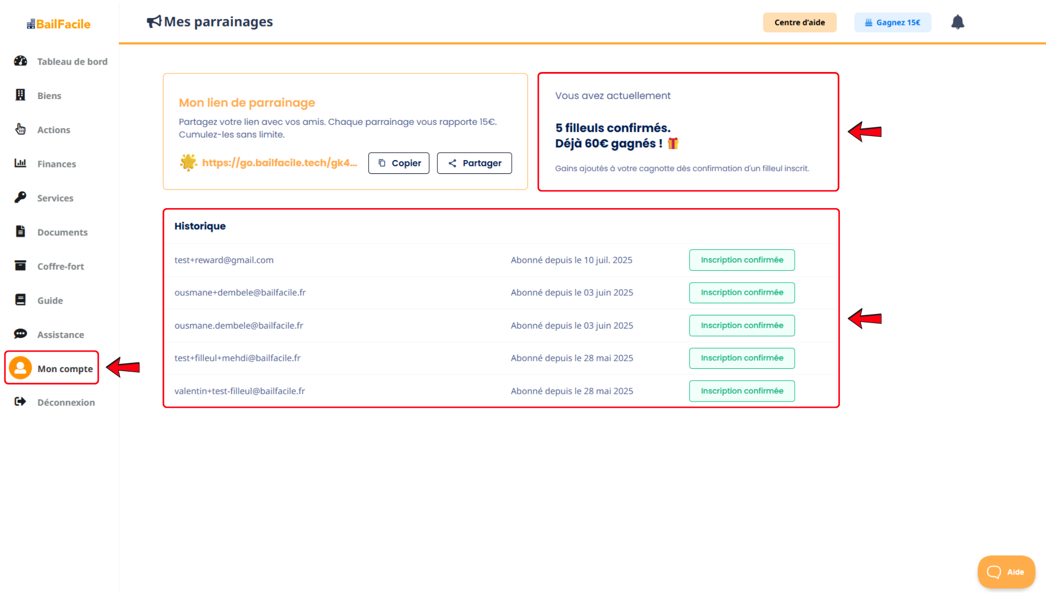 Sur votre espace parrainage, vous pouvez suivre le montant du crédit cumulé et la liste des filleuls ayant activé un abonnement 😉.