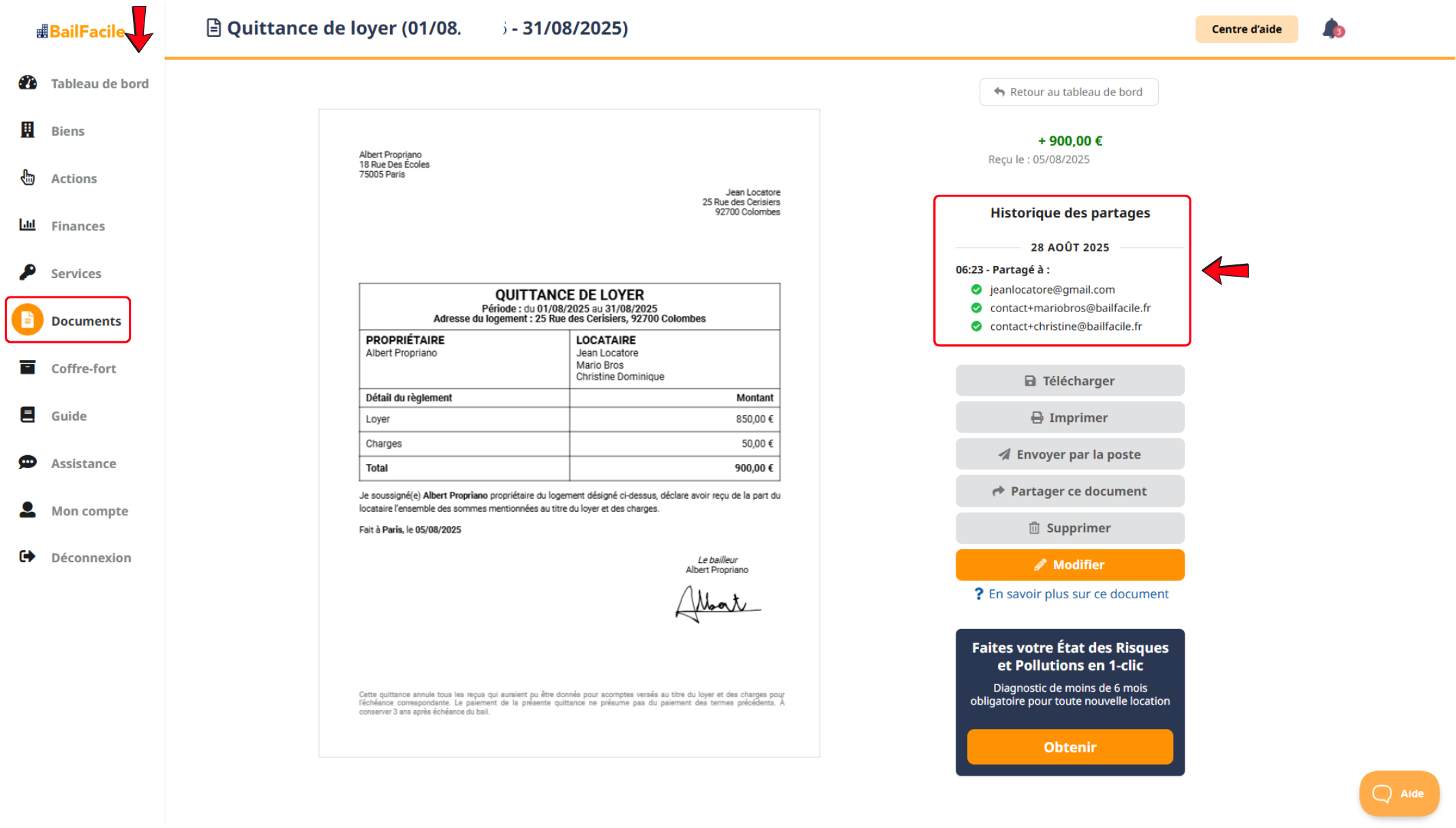 2 - Pour plus d'informations sur l'envoi comme le statut ou la date de partage, cliquez sur le document depuis votre tableau de bord